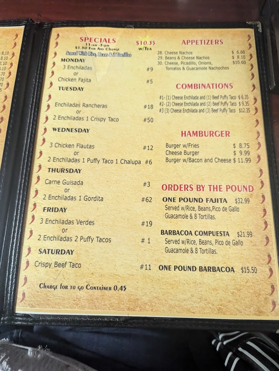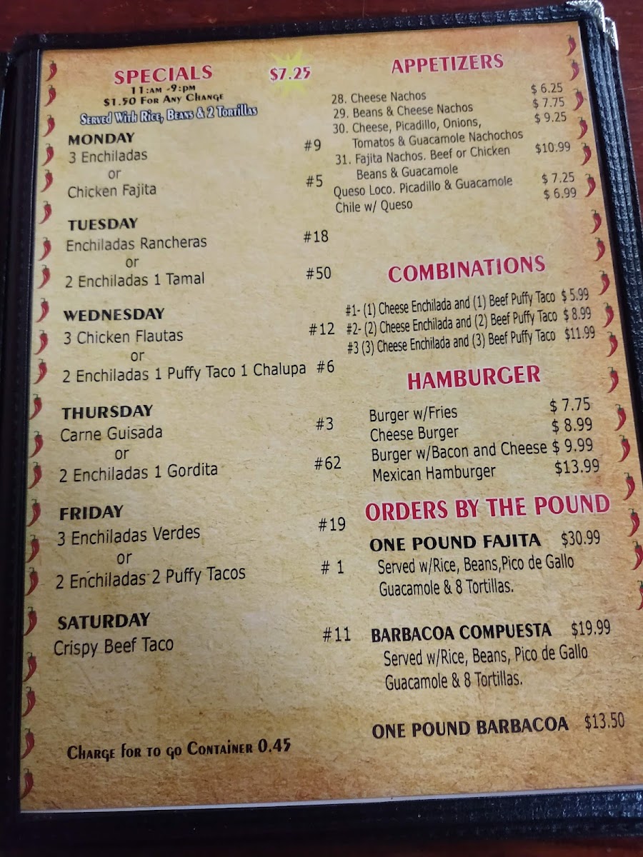 (1) cheese enchilada, chile relleno, (1) chalupa (bean & cheese).